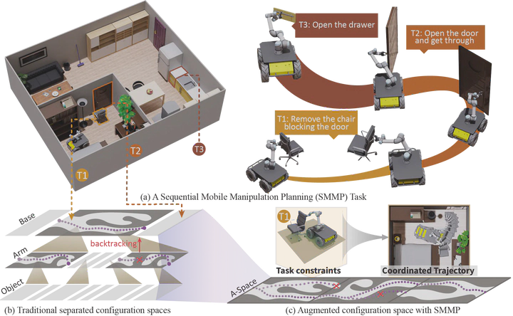 We present a Sequential Mobile Manipulation Planning (SMMP) framework that can solve long-horizon multi-step mobile manipulation tasks with coordinated whole-body motion, even when interacting with articulated objects. By abstracting environmental structures as kinematic models and integrating them with the robot’s kinematics, we construct an Augmented Configuration Apace (A-Space) that unifies the previously separate task constraints for navigation and manipulation, while accounting for the joint reachability of the robot base, arm, and manipulated objects. This integration facilitates efficient planning within a tri-level framework: a task planner generates symbolic action sequences to model the evolution of A-Space, an optimization-based motion planner computes continuous trajectories within A-Space to achieve desired configurations for both the robot and scene elements, and an intermediate plan refinement stage selects action goals that ensure long-horizon feasibility. Our simulation studies first confirm that planning in A-Space achieves an 84.6% higher task success rate compared to baseline methods. Validation on real robotic systems demonstrates fluid mobile manipulation involving (i) seven types of rigid and articulated objects across 17 distinct contexts, and (ii) long-horizon tasks of up to 14 sequential steps. Our results highlight the significance of modeling scene kinematics into planning entities, rather than encoding task-specific constraints, offering a scalable and generalizable approach to complex robotic manipulation.