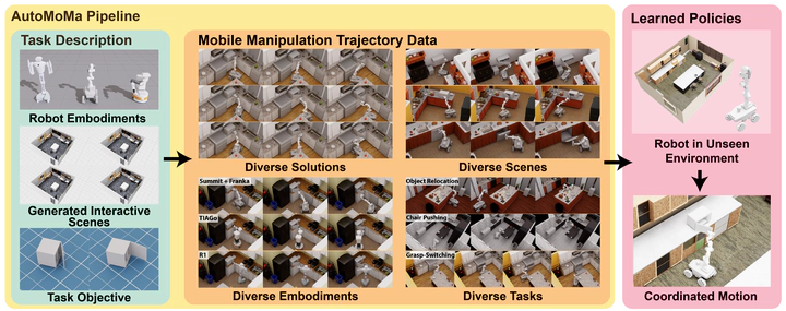 Robots deployed in unstructured environments must coordinate whole-body motion—simultaneously moving a mobile base and arm—to interact with the physical world. This coupled mobility and dexterity yields a state space that grows combinatorially with scene and object diversity, demanding datasets far larger than those sufficient for fixed-base manipulation. Yet existing acquisition methods, including teleoperation and planning, are either labor-intensive or computationally prohibitive at scale. The core bottleneck is the lack of a scalable pipeline for generating large-scale, physically valid, coordinated trajectory data across diverse embodiments and environments. Here we introduce AutoMoMa, a GPU-accelerated framework that unifies AKR modeling, which consolidates base, arm, and object kinematics into a single chain, with parallelized trajectory optimization. AutoMoMa achieves 5,000 episodes per GPU-hour, producing a dataset of over 500k physically valid trajectories spanning 330 scenes, diverse articulated objects, and multiple robot embodiments. Prior datasets were forced to compromise on scale, diversity, or kinematic fidelity; AutoMoMa addresses all three simultaneously. Training downstream imitation learning policies further reveals that even a single articulated-object task requires tens of thousands of demonstrations for state-of-the-art methods to reach around 80% success, confirming that data scarcity—not algorithmic limitations—has been the binding constraint. AutoMoMa thus bridges high-performance planning and reliable IL-based control, providing the infrastructure previously missing for coordinated mobile manipulation research. By making large-scale, kinematically valid training data practical, AutoMoMa showcases generalizable whole-body robot policies capable of operating in the diverse, unstructured settings of the real world.