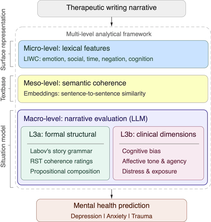 How people narrate their experiences offers a window into how the mind organizes them. Computational approaches to therapeutic writing have evolved from lexical counting to neural methods, yet remain fragmented: dictionary tools miss discourse structure, while embeddings conflate local coherence with global organization. No existing framework maps these techniques onto the hierarchical processes through which narratives are constructed. Here we introduce a three-level framework—micro-level lexical features, meso-level semantic embeddings, and macro-level Large Language Model (LLM) narrative evaluation—and show, across 830 Chinese therapeutic texts spanning depression, anxiety, and trauma, that macro-level evaluation substantially outperforms lexical and embedding features for mental health prediction. This challenges the field’s emphasis on word-counting: formal structural features (Labov’s story grammar, Rhetorical Structure Theory (RST) coherence, propositional composition) demonstrate that narrative organization per se carries predictive signal, while clinically-grounded narrative dimensions capture how psychological states are expressed through discourse. Semantic embeddings add minimal independent value but yield incremental gains in multi-level classification. By grounding computational levels in discourse processing theory, this framework identifies macro-structural organization as the primary locus of clinical signal and generates testable hypotheses for intervention design and longitudinal research.